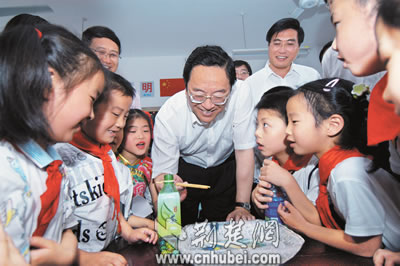 6月1日,武漢市武昌區(qū)為民小學(xué)。兩棵高大的榆樹(shù)在小小的院子灑滿了濃陰,一群孩子活蹦亂跳玩著游戲。省委書(shū)記俞正聲滿面春風(fēng)地來(lái)到了孩子們中間。