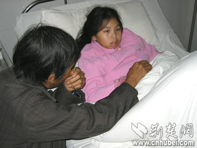 在縣人民醫(yī)院內(nèi)三科9病房里,潔白的病床上躺著一個面色蒼白、嘴唇發(fā)烏的小姑娘,她就是楊青。在楊青艱難地望過來的時(shí)候,記者的心不禁打了個顫:大眼睛沒有一絲神采!記者反復(fù)醞釀的問候語哽在喉中。楊青的父母、奶奶、姑媽,卻忍不住悲傷,淚如雨下。“楊青,你痛不痛?”“痛……”楊青張了張嘴,聲音弱得幾乎聽不見!澳睦锿,告訴阿姨好嗎?”“全身都痛!睏钋囝澏吨鲁鲞@4個字后,不再開口說話。