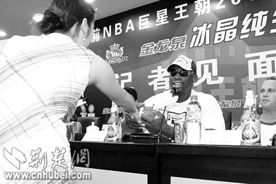 “大蟲”似乎不為所動,拿起行李,在保安的保護(hù)下向外走。記者們忙起來了,兩位來自電視臺娛樂頻道的記者拿著話筒,沖到羅德曼面前,踮起腳跟,不斷用英語發(fā)問。