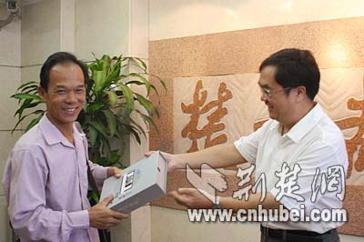 來自赤壁的幸運讀者接受江總編輯頒發(fā)的獎品,這位龍先生非常高興,他說他的手機正好該換了,沒想到運氣這么好得到一部這么好的手機。