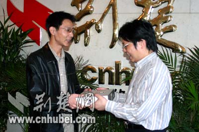 荊楚網(wǎng)副總編輯黃斌給從松滋趕來領(lǐng)獎(jiǎng)的牟先生發(fā)獎(jiǎng)