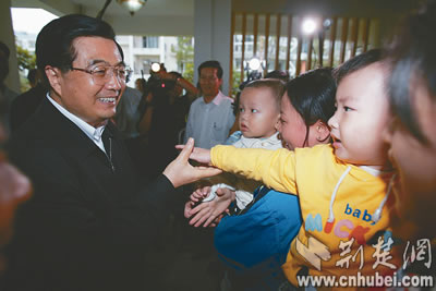 “胡爺爺好!”在武漢綠景苑節(jié)能小區(qū),小朋友們向胡錦濤總書(shū)記問(wèn)好。