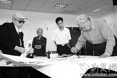 九九重陽節(jié),武漢市老年書畫研究會的20多位老書畫家,應(yīng)邀參加“紀念抗戰(zhàn)勝利六十周年書畫筆會”。圖為原解放軍總后武漢基地指揮部中將司令員、武漢市老年書畫研究會名譽會長張書坤奮筆作書“勿忘國恥,不辱使命”八個遒勁有力的大字。