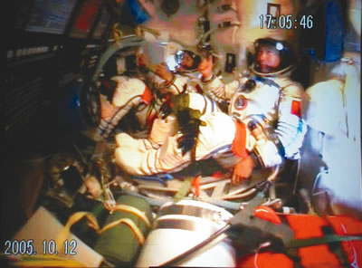 17時(shí)29分,航天員向地面飛控中心報(bào)告飛船工作正常,已做好開啟返回艙艙門的準(zhǔn)備。在得到地面指揮員的指令后,費(fèi)俊龍打開返回艙艙門,在聶海勝的幫助下進(jìn)入軌道艙工作。
