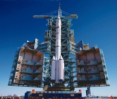 長征二號F型火箭等待著它的第6次飛行。兩小時(shí)45分鐘前,執(zhí)行神舟六號載人航天飛行任務(wù)的航天員費(fèi)俊龍和聶海勝進(jìn)入飛船返回艙,“神箭”和“神舟”第一次迎來了兩名乘客。