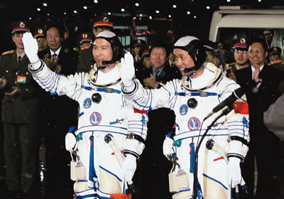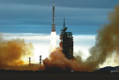 9時(shí)整,費(fèi)俊龍、聶海勝乘坐神舟六號飛船在長征火箭的托舉下,飛向太空。