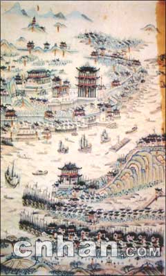 此圖藏于大連市圖書館,手繪彩圖。未標明作者姓名和成圖時間,圖中標注了武昌、漢口“龍王廟”等。筆者鑒定此圖為清代中期作品,根據是圖中有“龍王廟”,而龍王齋建于乾隆四年(1739年),故此圖當于1739年以后所繪。但圖中沒有出現漢口城堡,而漢口城堡建于1864年,同時圖中只繪有木帆船,而未出現現近代輪船。武漢江面出現航運和輪船是1862年以后?芍,此圖當成于1862年前?纱篌w界定此圖繪于1739年至1862年之間。