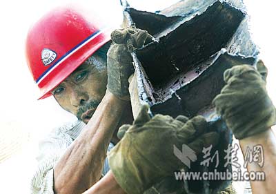 現(xiàn)場施工的8名農(nóng)民工都來自監(jiān)利縣。他們有的用焊槍切割船體,有的將割好的鋼板搬到岸上。每塊鋼板重約80公斤,兩個人抬著走,豆大的汗珠布滿黝黑的臉龐,隨著移動的腳步一滴滴滾落地上。