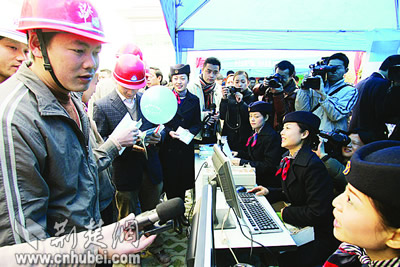 像譚梅一樣,昨天共有300多名農(nóng)民工涌到武漢市總工會大院,參加了在這里舉行的武漢市農(nóng)民工“平安返鄉(xiāng)”票務趕集會。在武漢市總工會組織下,漢口火車站、傅家坡長途汽車站、武漢港務集團客運站等7家客運單位,紛紛來到趕集會現(xiàn)場,為農(nóng)民工提供熱情的票務服務。