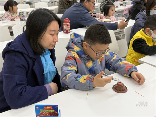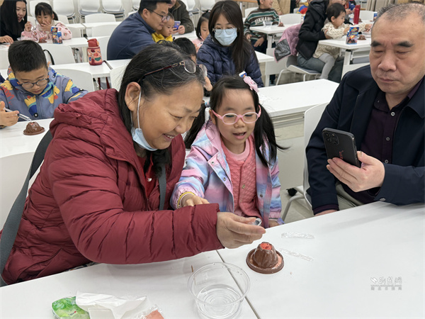 為讓抽象原理更直觀,活動設(shè)置模擬火山噴發(fā)實驗環(huán)節(jié)?,F(xiàn)場備好黏土火山模型、小蘇打、白醋等物料,容東林一邊操作一邊講解:向“巖漿腔”倒入小蘇打并加紅色素,再注入白醋,紅色“巖漿”瞬間噴涌而出,引得居民驚嘆、孩子們目不轉(zhuǎn)睛。他引導大家觀察全過程,深入淺出解釋酸堿反應(yīng)原理及火山灰對生態(tài)環(huán)境的影響,還邀請孩子們近距離體驗,激發(fā)科學探索興趣。