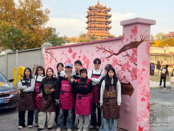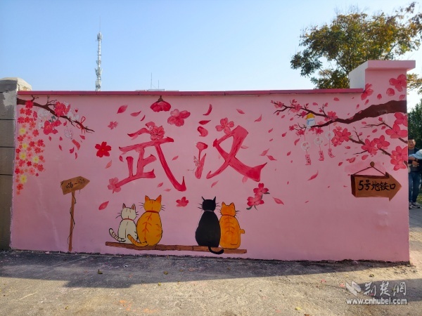 次日,創(chuàng)作進入精修階段。志愿者們細致調(diào)整“武漢”字樣的色彩飽和度,用粉白顏料層層暈染出飛揚的櫻花花瓣。四只形態(tài)各異的貓咪相依蹲坐,靈動可愛;特意添加的“5號地鐵口”指引牌等實用元素,更讓作品兼具藝術(shù)性與功能性。創(chuàng)作過程中,不斷有居民和游客駐足觀賞,主動詢問設(shè)計理念。“我們想通過櫻花、貓咪等元素,展現(xiàn)武漢的浪漫與煙火氣?!敝驹刚咭贿呎{(diào)色一邊向圍觀群眾講解。