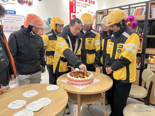 活動(dòng)現(xiàn)場(chǎng)洋溢著濃濃的溫情。驛站內(nèi),“生日快樂”的主題裝飾錯(cuò)落擺放,工作人員還精心準(zhǔn)備了定制生日蛋糕、可愛的生日帽,將小小的驛站裝點(diǎn)成充滿歡笑的“生日之家”。伴隨著熟悉的《生日快樂》旋律響起,外賣騎手、環(huán)衛(wèi)師傅們圍在一起,共同吹滅蠟燭、許下心愿,分享這份屬于他們的甜蜜與喜悅。