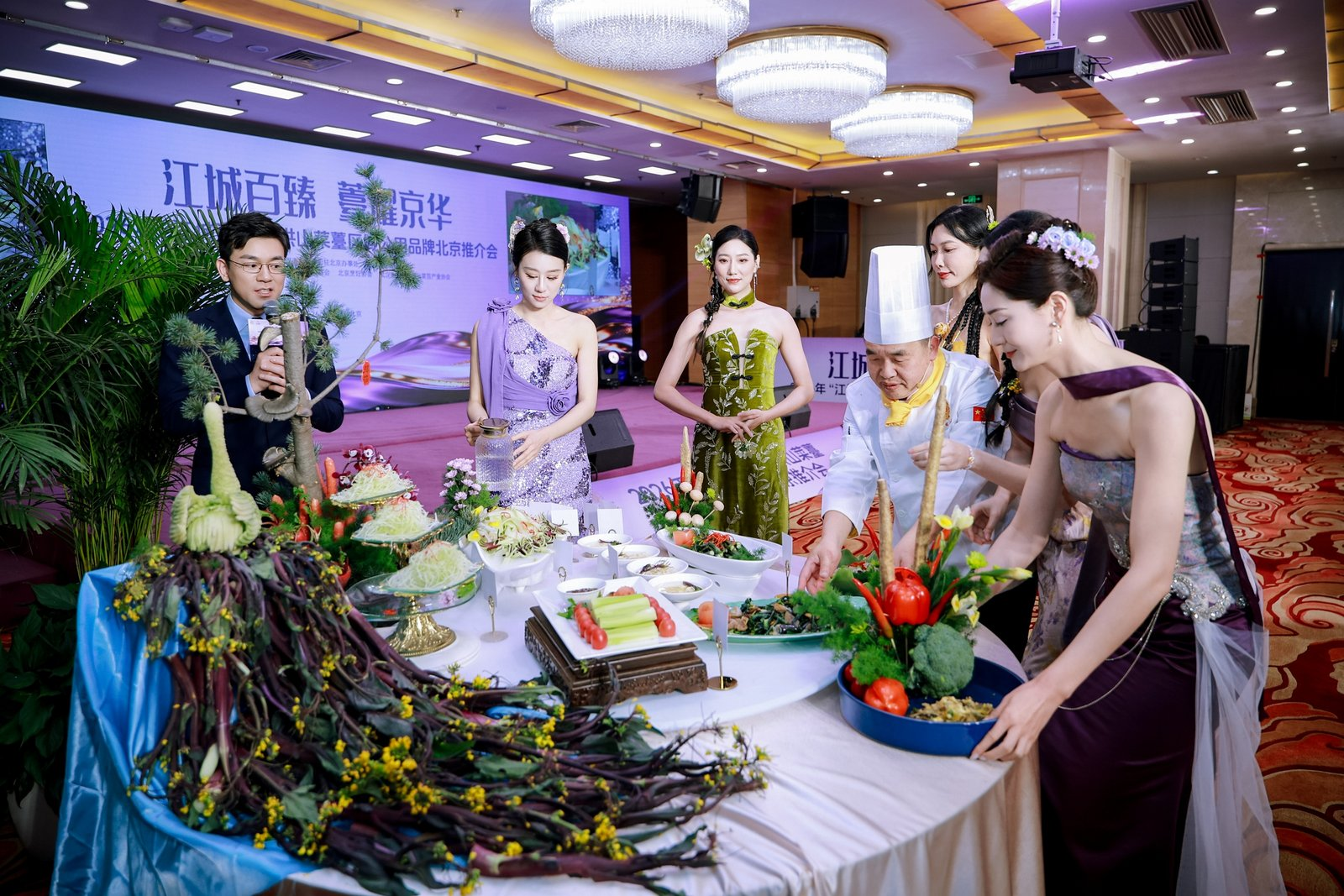 活動現(xiàn)場,《千年一“薹”,京誠所愛》情景劇生動詮釋洪山菜薹的傳承與創(chuàng)新,產(chǎn)品走秀與藝術(shù)插花表演凸顯其美學價值,楚菜名廚現(xiàn)場演繹“一薹多吃”宴席,展現(xiàn)菜薹融入京鄂風味的烹飪創(chuàng)意。京城網(wǎng)紅大廚隋坡登臺品鑒,為洪山菜薹實力“打call”?,F(xiàn)場同步設(shè)置國風市集,展出鮮薹、鎖鮮產(chǎn)品及禮盒,供嘉賓品鑒體驗。