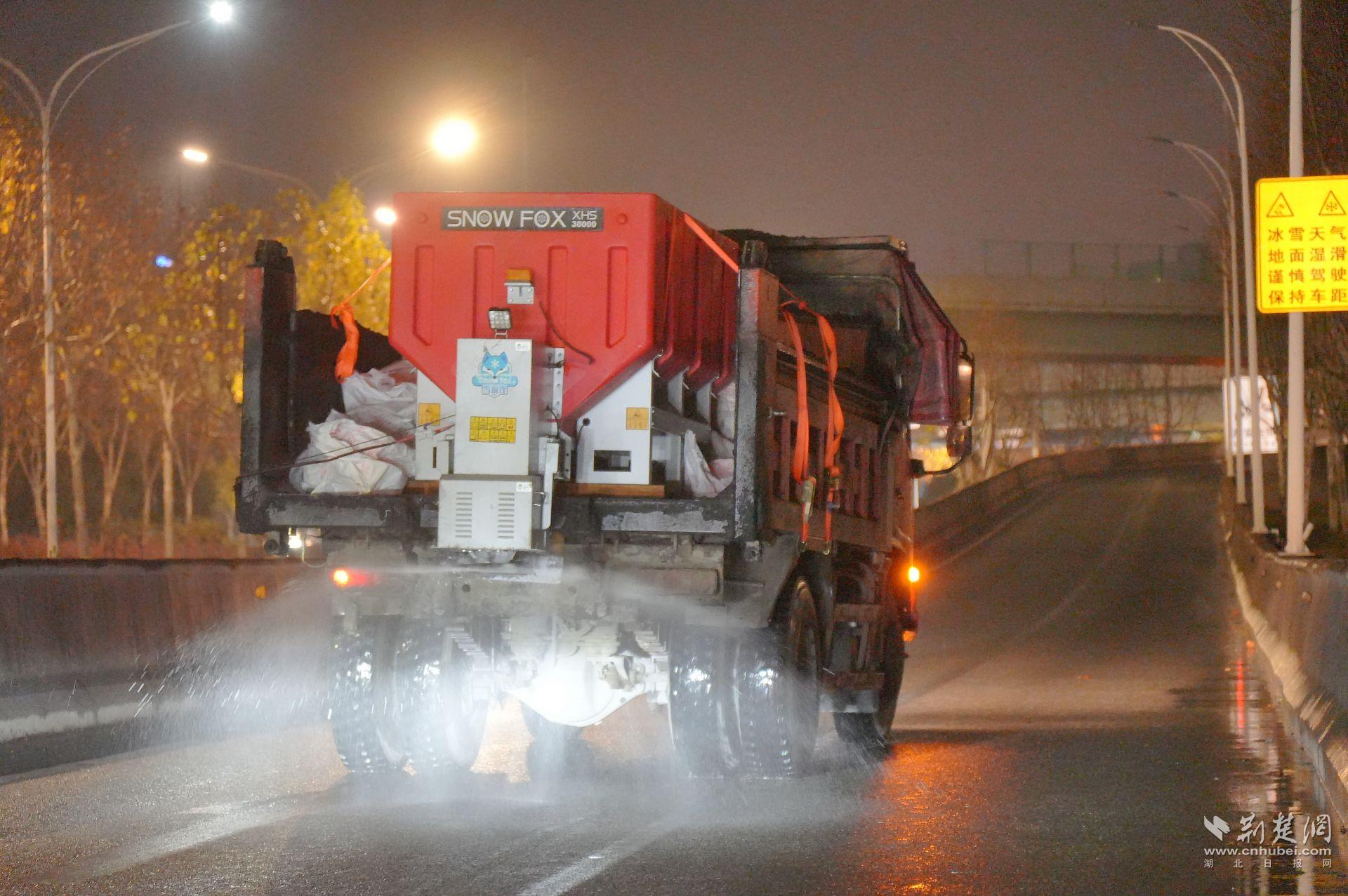 指令發(fā)出后,一線力量迅速到位。22時左右,硚孝高速匝道口,區(qū)服投臨空港市政環(huán)衛(wèi)公司的三臺融雪劑撒布機同步作業(yè)。融雪劑被均勻鋪撒在匝道和橋面,為后續(xù)可能出現(xiàn)的結(jié)冰提前“打底”。