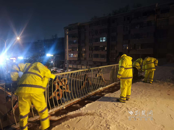 1月19日深夜至20日凌晨,隨著雪勢(shì)加大,街道應(yīng)急搶險(xiǎn)隊(duì)伍迅速化身“風(fēng)雪夜行人”,頂著嚴(yán)寒奔赴一線。他們采取機(jī)械作業(yè)與人工作業(yè)相結(jié)合的方式,對(duì)轄區(qū)主次干道、橋梁、陡坡、十字路口等重點(diǎn)路段和易結(jié)冰區(qū)域,進(jìn)行循環(huán)撒布融雪鹽和清掃作業(yè),最大限度預(yù)防道路結(jié)冰。寒夜中,隊(duì)員們衣衫被雪花浸濕,臉頰被寒風(fēng)凍紅,但無人退縮,持續(xù)堅(jiān)守。天色微明,雪勢(shì)稍歇,隊(duì)伍立即轉(zhuǎn)戰(zhàn),對(duì)背街小巷、人行道、天橋等區(qū)域的殘留積雪進(jìn)行清理,并在坡道、臺(tái)階等易滑處鋪設(shè)防滑草墊、設(shè)置警示標(biāo)識(shí),全力保障早高峰出行安全順暢。
