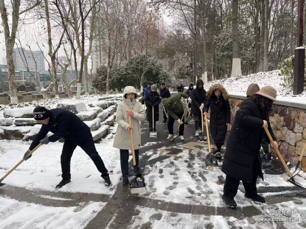 轄區(qū)文明單位積極行動(dòng),彰顯社會(huì)責(zé)任。黃鶴樓公園管理處、辛亥革命博物院領(lǐng)導(dǎo)班子帶隊(duì)鏟雪除冰,保障游客安全游覽;武漢大學(xué)人民醫(yī)院黨委書記、院長與干部職工一同清掃院區(qū)積雪,確保患者就醫(yī)暢通;武漢市第三醫(yī)院領(lǐng)導(dǎo)干部聯(lián)合武昌區(qū)九三學(xué)社三醫(yī)院支社社員開展鏟雪行動(dòng),筑牢患者就醫(yī)安全防線;聯(lián)通武昌區(qū)分公司組織清除辦公樓及周邊道路積雪;中國郵政武昌區(qū)分公司各網(wǎng)點(diǎn)員工利用營業(yè)前后時(shí)間清掃門前冰雪,鋪設(shè)防滑墊、設(shè)立提示牌,為客戶開辟“安心通道”;七四三五工廠保衛(wèi)處以“雪停人動(dòng)、人到雪清”的擔(dān)當(dāng),組織清掃廠區(qū)大門區(qū)域積雪,筑牢安全防線。