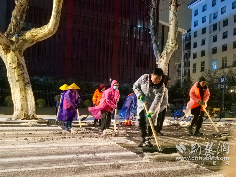 20日凌晨30分,武昌區(qū)中華路街道迅速組織力量,街道、轄區(qū)應(yīng)急分隊(duì)、環(huán)衛(wèi)工人、物業(yè)以及社區(qū)志愿者等80余人,連夜對中華路、解放路、民主路、都府堤路等重要干道展開連夜作業(yè);凌晨5時(shí),洪山區(qū)執(zhí)法中心組織力量對文治街、書城路沿線長達(dá)1.2公里的人行道展開"地毯式"清障,累計(jì)清除積雪積冰約2000平方米;早上6時(shí),江岸區(qū)花橋街道380余人的除雪隊(duì)伍集中對校園周邊、小區(qū)出入口、主干道人行道的積雪進(jìn)行重點(diǎn)清掃,累計(jì)清理積雪約0.8噸。