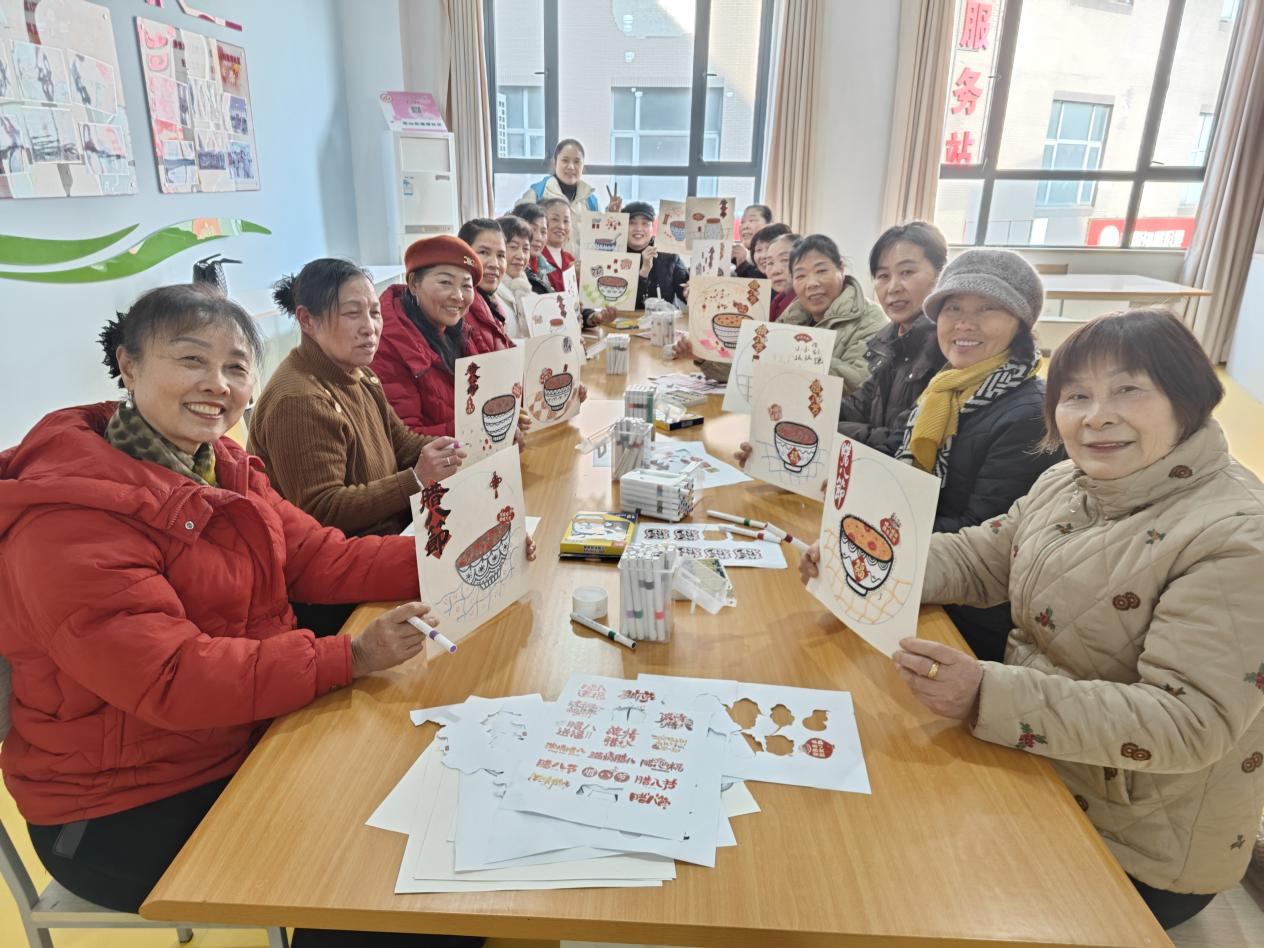 社區(qū)老年人活動中心內(nèi),老人們圍坐在一起體驗“溫情臘八”手工繪畫,在創(chuàng)作中增進(jìn)鄰里情誼?!昂枚嗄隂]畫過畫了,今天好像回到了年輕時候!”74歲的李庭香老人舉著自己剛完成的《臘八團(tuán)圓圖》笑著說道。