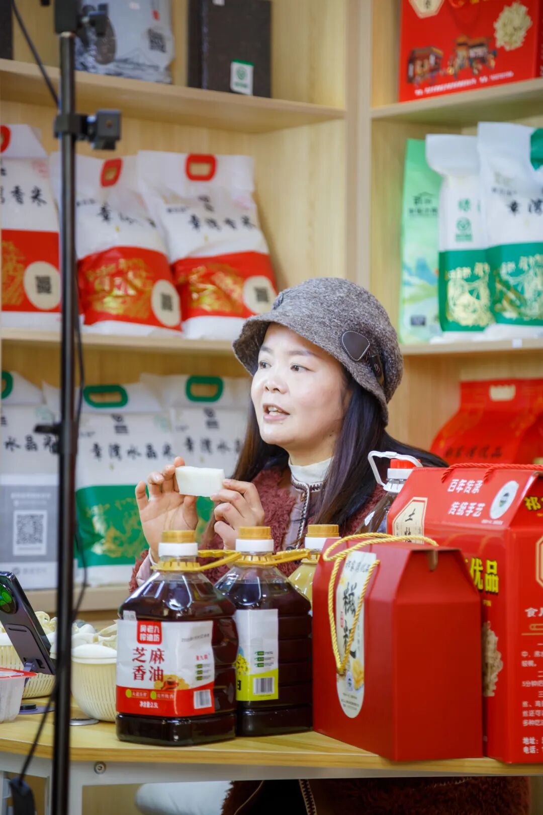 直播基地總面積達300㎡,是街道精心打造的綜合性農(nóng)業(yè)服務(wù)窗口,依托武漢云上耕農(nóng)業(yè)發(fā)展有限公司搭建的優(yōu)質(zhì)供應(yīng)鏈,匯聚了祁家灣及周邊十余家家庭農(nóng)場、合作社的二十余種特色產(chǎn)品——鮮榨菜籽油、優(yōu)質(zhì)大米等糧油調(diào)味,純散養(yǎng)土雞蛋、手工豆絲、風(fēng)干魚等特色農(nóng)產(chǎn)品,應(yīng)有盡有。