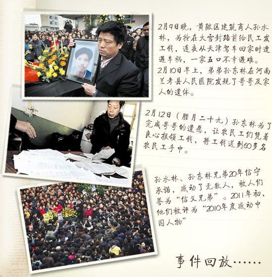 “信義兄弟”再行義舉。昨日,為繼承哥哥孫水林的遺愿,孫東林決定將社會各界送來的33.4萬余元獎金和慰問金全部捐出,設(shè)立農(nóng)民工意外傷害幫扶基金。