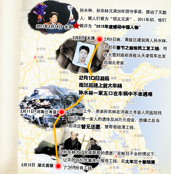 “信義兄弟”守信踐諾的事跡受到中央、省、市領(lǐng)導(dǎo)及社會各界的高度評價,省委書記李鴻忠近日親切接見了“信義兄弟”孫東林,稱贊“信義兄弟”為湖北人民爭了光。