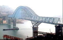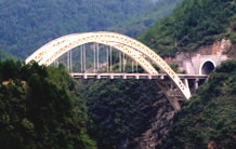 湖北宜萬鐵路野三河大橋位于湖北省恩施州建始縣與巴東縣交界處,它是一座主跨為124米不對稱雙線平行雙肋中式復(fù)合鋼管混凝土桁架坡拱橋,由中承式拱橋和下承式拱橋兩部分組成,這種不對稱坡拱橋在國內(nèi)尚屬首例。該橋由湖北省交通規(guī)劃設(shè)計(jì)院設(shè)計(jì),于2006年3月份開工,2007年1月成功合龍。