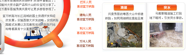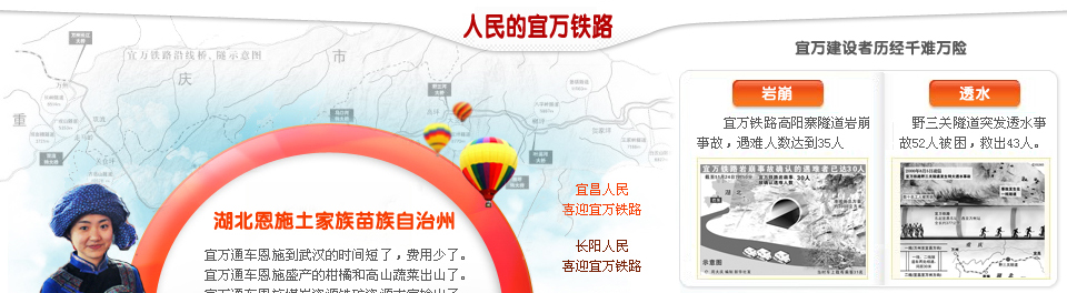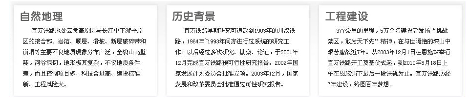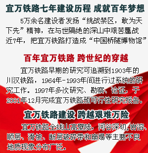 宜萬鐵路因穿越喀斯特地貌地區(qū),被譽(yù)為我國鐵路史上施工難度最大的山區(qū)鐵路工程。它集“西南山區(qū)鐵路艱險之大成”,專家們稱之為“筑路禁區(qū)”。修建難,最難在隧道。宜萬鐵路的159座隧道中有70%位于石灰?guī)r地區(qū)。在中國鐵路建設(shè)史上,因?yàn)橐巳f鐵路,第一次為鐵路隧道按風(fēng)險分為輕、中、高3個等級。