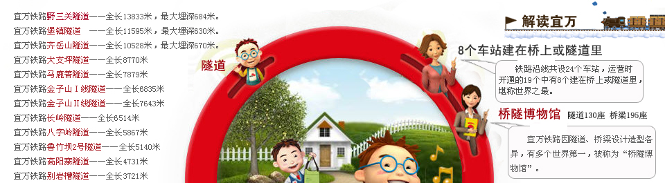 宜萬鐵路被稱為“橋隧博物館”。全線共有隧道159座(其中一級風(fēng)險隧道8座,二級風(fēng)險隧道26座),其中10公里以上隧道5座,總長338.7公里;全線有橋梁253座,總長69.64公里,其中特殊結(jié)構(gòu)橋梁29座,涵洞600多座;正線橋隧占線路總長的74%。據(jù)中鐵四局宜萬指揮部人士稱,宜萬鐵路的橋隧占比為世界之最。