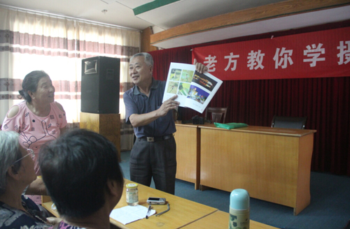 8月2日下午,在經(jīng)過半天休整之后,方老師開始為團員們講課!拔覀兝夏耆藨撚凶约旱呐d趣和追求,要學會自己找樂!薄艾F(xiàn)在小孩都是老年人在帶,我們學會了攝影就可以教孩子,對他們將來也有好處!狈嚼蠋煹囊幌,頓時就讓許多團員萌生了學攝影的想法。接著,他向團員們展示了自己拍攝的眾多精彩照片,并拿出一本攝影圖集供大家傳閱!斑@本圖集里,都是我在老年大學教書時,學員們拍的照片。最大的學員都80多歲了,但是照片拍的特別好。相信大家通過學習,也可以拍的如此精彩!狈嚼蠋煹脑,給了在座的老人極大的信心,大家也學的更加認真。