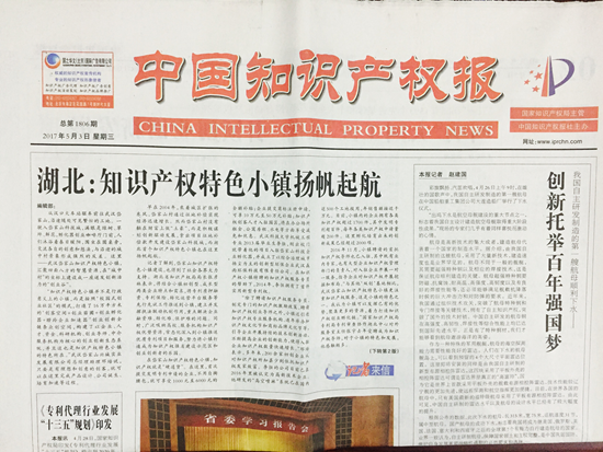 5月3日,中國知識產(chǎn)權(quán)報頭版頭條刊登了《湖北:知識產(chǎn)權(quán)特色小鎮(zhèn)揚(yáng)帆起航》的新聞,向百萬公眾報道了武漢岱家山知識產(chǎn)權(quán)特色小鎮(zhèn)。